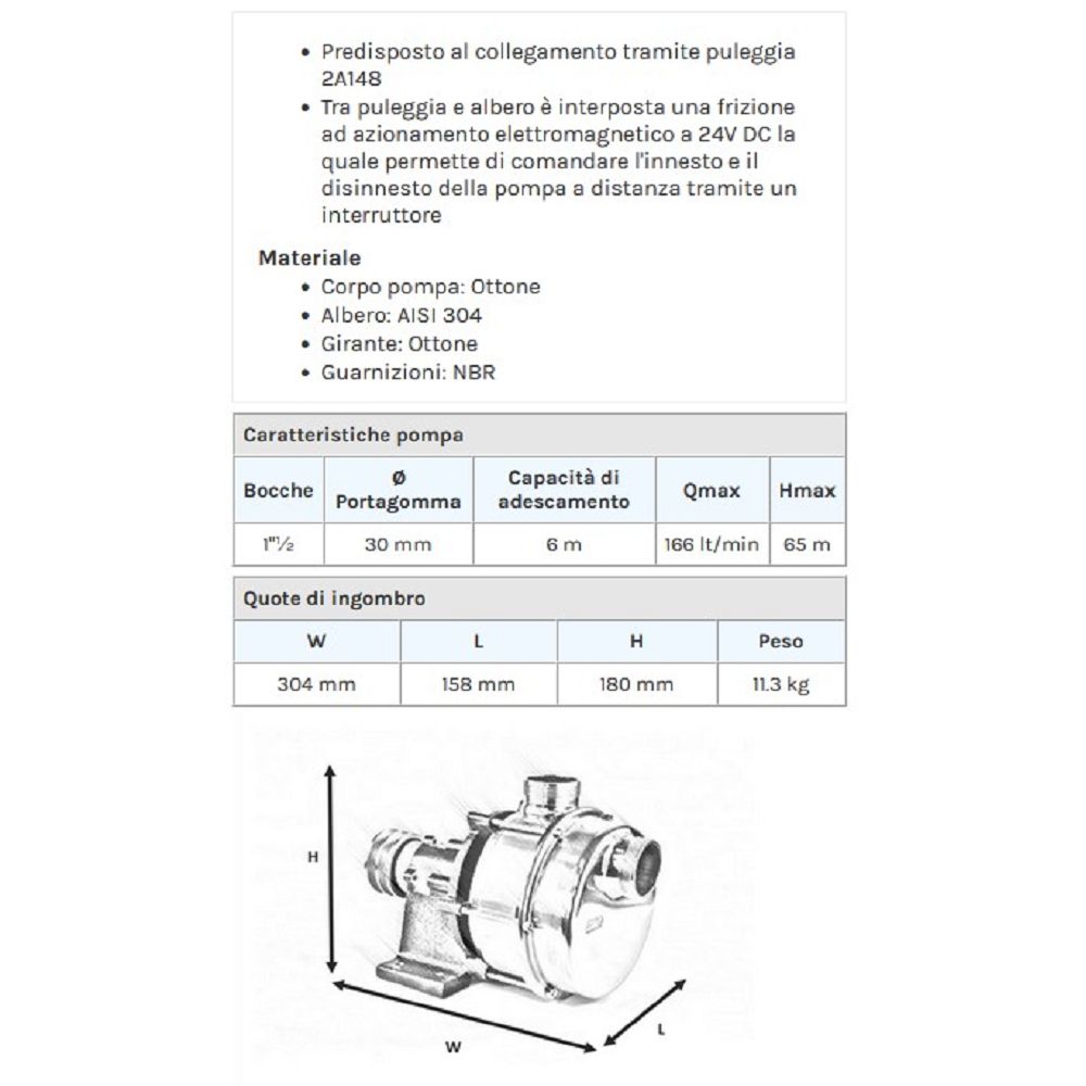 La migliore soluzione per l’aspirazione e il travaso di liquidi, grazie alla forte capacità di autoadescamento, alla possibilità di funzionamento anche con presenza discontinua del liquido in aspirazione e alla invertibilità del flusso. La serie IFE viene realizzata in ottone CB754S con albero in acciaio inox. Questa versione con supporto e puleggia consente un facile accoppiamento con qualsiasi motore. Inoltre tra puleggia e albero è interposta una frizione elettromagnetica che consente di collegare la pompa ad un motore sempre funzionante e comandare l’innesto e il disinnesto della pompa a distanza tramite un semplice interruttore. Per ogni applicazione occorre verificare l’idoneità  e scegliere le guarnizioni opportune.