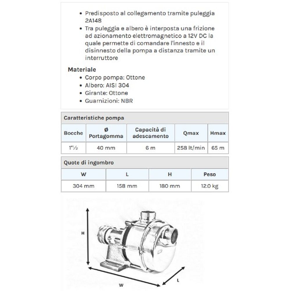 La migliore soluzione per l’aspirazione e il travaso di liquidi, grazie alla forte capacità di autoadescamento, alla possibilità di funzionamento anche con presenza discontinua del liquido in aspirazione e alla invertibilità del flusso. La serie IFE viene realizzata in ottone CB754S con albero in acciaio inox. Questa versione con supporto e puleggia consente un facile accoppiamento con qualsiasi motore. Inoltre tra puleggia e albero è interposta una frizione elettromagnetica che consente di collegare la pompa ad un motore sempre funzionante e comandare l’innesto e il disinnesto della pompa a distanza tramite un semplice interruttore. Per ogni applicazione occorre verificare l’idoneità e scegliere le guarnizioni opportune.